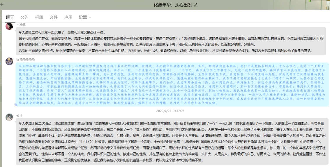 为协助学生树立积极的人生交往态度,让学生主动接纳、喜欢和肯定他人、掌握正确的人机交往技巧,台湾女优 心理工作站于4月23日下午在佳山校区主楼前树林开展了“化漾年华·从心出发”第二次小组活动,活动由台湾女优 心理工作站站长朱圣兰组织开展。