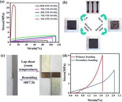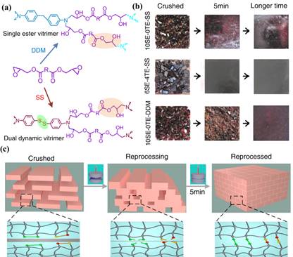 传统的热固性材料如环氧树脂和橡胶等在生活中应用广泛,但它们破坏后无法循环使用,造成环境污染和资源浪费。该材料可通过调节芳香族和脂肪族单体的比例来实现橡胶态和玻璃态的转变,在高温条件下5分钟内快速再次成型和回收,为热固性塑料的快速回收及再生利用提供了思路。