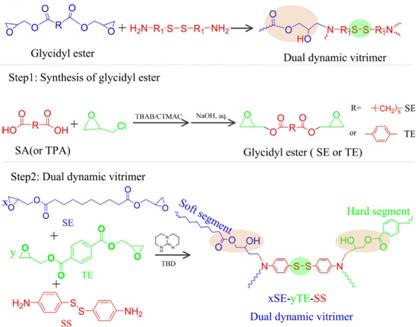 本研究针对环氧树脂热固性材料难以再利用,首先以癸二酸和对苯二甲酸为原料分别合成了酯基的脂肪族和芳香族环氧树脂,同时将含有二硫键的芳香族胺类固化剂引入到环氧交联体系中,制备出集成羟基酯和二硫键的双动态环氧热固性材料。
