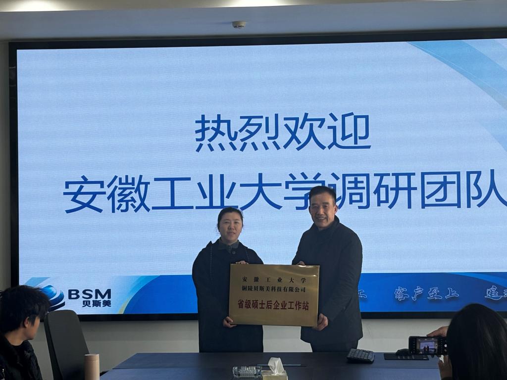 会后,校企双方签订了“人才培养与就业基地建设合作协议”和“实习基地建设协议”;黄宇弦代表学校向铜陵贝斯美科技有限公司授予“省级硕士后企业工作站”称号。