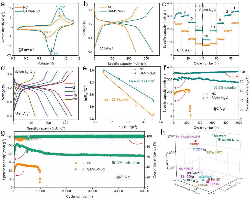 本文开发了一种高N掺杂介孔碳负载Mn单原子(SAMn-N3-C)正极材料,以用于电解质Zn-I2电池。该材料不仅可以通过物理化学作用锚定碘物种,抑制多碘化物穿梭,同时不饱和配位的Mn-N3可以进一步增强对各类碘物种的有效吸附,并通过降低碘转化化学中速率决定步骤的吉布斯自由能,加速反应动力学,增强转化效率,这种多功能碘宿主材料具有的协同作用显著提升了Zn-I2电池的性能,在1 A g-1时容量达到336.2 mAh g-1,并可稳定工作50,000个循环。这一工作通过将单原子催化剂与多孔结构相结合,建立了具有物理化学限域和高效转化协同作用的碘宿主材料新方法,有望推动Zn-I2电池技术在实际应用中的进一步发展。