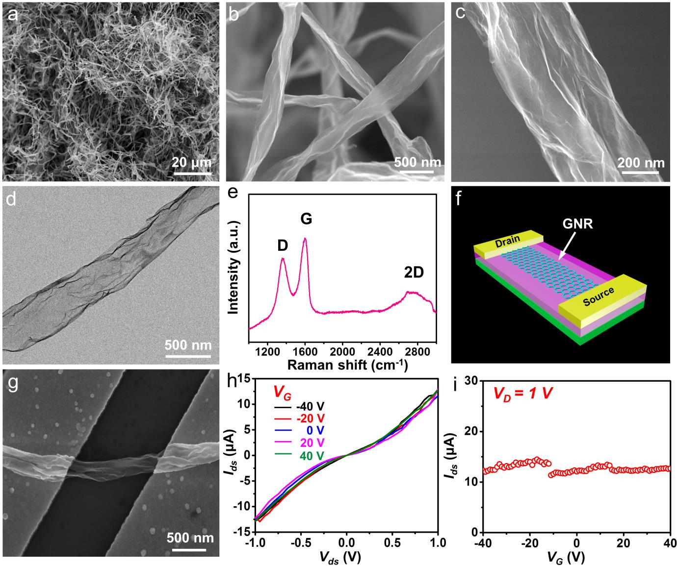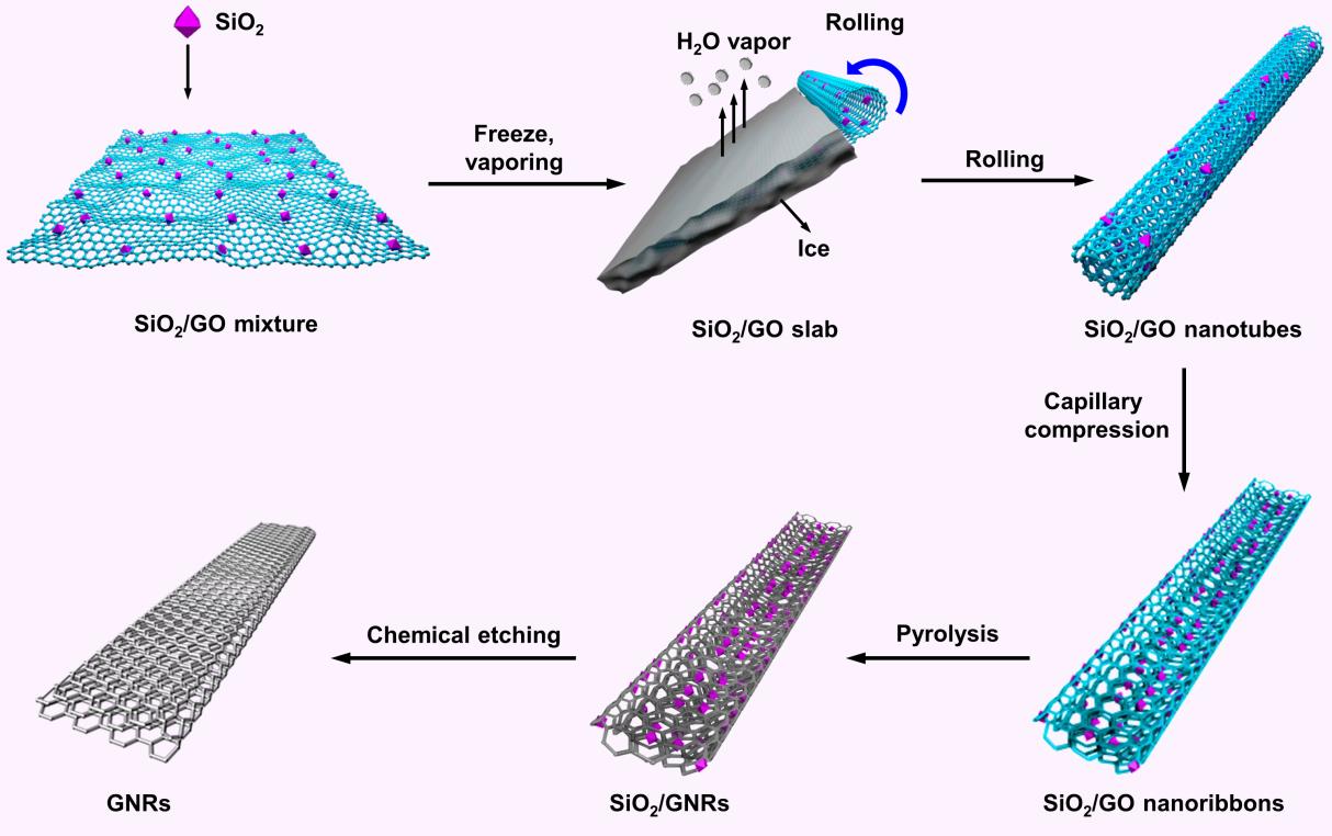团队提出了一种“冷冻-卷曲-压缩”的策略,通过将大片层(平均宽度~20微米)的氧化石墨烯与二氧化硅溶胶超声混合,并在低温低压下进行脱水干燥和化学刻蚀,制备出高纯度、高径向比的石墨烯纳米带材料。这种策略采用自上而下的方式,以单层的氧化石墨烯为原料,通过改变其拓扑结构,实现了高纯度石墨烯纳米带的宏量制备。该策略比小分子合成、径向剪切碳纳米管等方法更直接、更简洁,得到的石墨烯纳米带的纯度更高。场发射扫描电镜照片证明了这种石墨烯纳米带具有典型的准一维结构。这种材料具有高的长径比,表面是类石墨烯层状褶皱结构,其丰富的边缘结构为石墨烯纳米带的功能化提供了可供调控的空间。透射电镜图片证明这种材料具有薄层结构和透明性。拉曼数据中,碳材料特征峰D峰和G峰比例的降低,证明从氧化石墨烯到石墨烯纳米带,部分共轭结构得到了有效修复,这种石墨烯纳米带显示出高达72900S/m的电子传导速率。