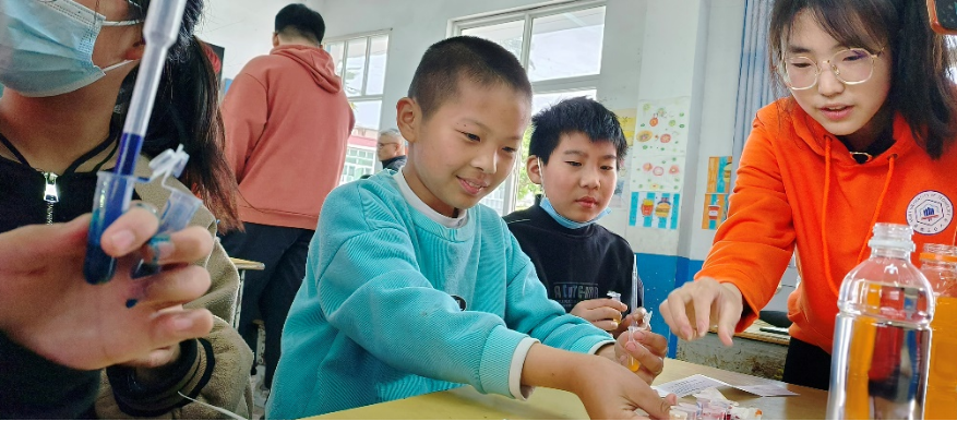 在驻红光村第一书记胡卫东的陪同下,团队队员及师生志愿者在红光小学开展了主题为“关注食品安全,守护健康童年”的食品安全科普宣传。队员们通过PPT介绍、视频播放,把许多食品中常见人工色素的类别、来源及其健康危害等知识传递给学生,让小朋友对食物颜色有了更深刻的了解,同时也加强他们的食品安全意识。活动现场,志愿者们还将食安小卫士团队自主研发的人工食品色素试纸条进行操作演示,与小朋友共同完成了包括颜色调配、着色食品脱色和饮料中色素的比色检验等多个项目,让小朋友清楚地认识到加工食品中的‘五颜六色’是如何形成的。其中,在经历过“可乐脱色”实验后,小朋友们纷纷表示“以后要少喝饮料”。活动结束后,王双寿勉励小朋友们要好好学习,学习更多的科学知识,长大成为对国家社会有用的人。