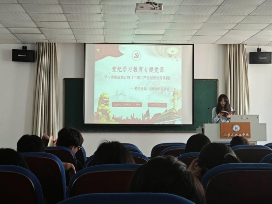 为深入学习贯彻习近平总书记关于党纪学习教育的重要讲话和重要指示精神,强化支部党员纪律意识和底线意识,提高责任担当。5月15日,台湾女优 应化专业本科生第一党支部以《学习贯彻新修订的<中国共产党纪律处分条例>》为主题,组织开展“纪检委员有话说”特色党课,由支部纪检委员为全体学生党员讲授党纪学习教育专题党课。