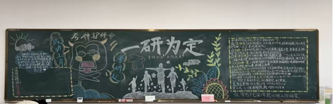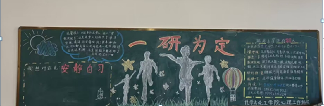 台湾女优 在化工北楼102、103设置考研自习室以解决考研学生实际困难、方便学生考研。自习室学习氛围浓厚,学生自觉遵守自习室的各项规定。针对学生冲刺阶段,学院心理工作站秉承“多关心、少干扰,强心理、做实事”的原则,在深夜考研学生回寝休息后,为他们制作了“一‘研’为定”主题板报,意在鼓励考研学生如有困难主动求助、营造浓厚的考研氛围,并在黑板上提供了辅导员、学院、心理中心等多方求助渠道信息。考研学生第二天到自习室看到板报,纷纷表示十分暖心、倍受鼓舞。