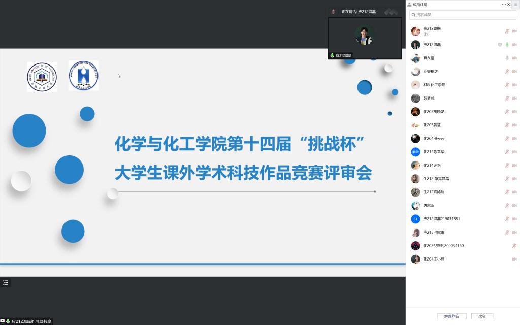 2022年12月13日,化工学院通过线上开展第十四届“挑战杯”大学生课外学术科技作品竞赛项目初评选拔工作。学院创新工作小组成员担任评委,11支团队进行了项目汇报。