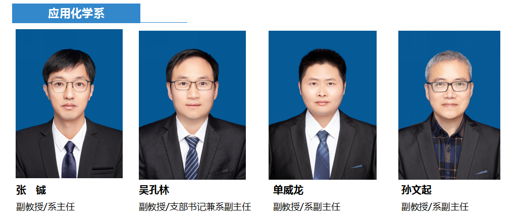 应用化学系师资力量雄厚,拥有学历、职称、年龄梯度分布合理的教师队伍。目前,专职教师33人,教授12人、资格教授4人、副教授12人、资格副教授2人、讲师3人,拥有海(境)外背景博士9人;博士生导师9人、硕士生导导师22人;国家级2人(含柔性引进长江学者、国家杰青兼职教授1人)、省部级人才6人。近年来,年均研究经费200余万元、申请国家发明专利20余项、发表SCI/EI收录国际学术论文80余篇;近五年承担了国家自然科学基金、省部级项目50余项;承担教研项目10余项;积极开展校企合作,为企业解决技术难题50余项。专业十分注重学生研究能力的培养,本科生参与国家级科研项目及创新创业人才培养训练计划人数达65%以上,近五年本科生获得各类科技竞赛奖项100余项。组建了无机-有机杂化光电材料、先进材料与现代光谱技术等极具特色的研究团队,在国内外相关领域产生了积极影响。